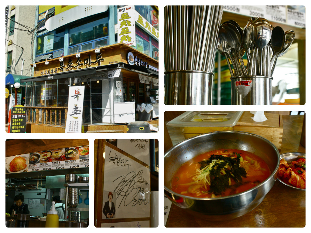 More aimless walking until surprise! – a familiar street that was some sort of a parking space. I was feeling a bit hungry so when I saw a restaurant that seemed open (as most food places in the area were still closed and that was already 12 noon! Maybe Koreans rarely eat lunch outside?), I gave it a try. I was up for something really spicy and something to warm me up on a cold day so I chose some spicy soup with some dumplings. It was my first decent meal alone in the city and it turned out to be a good choice.