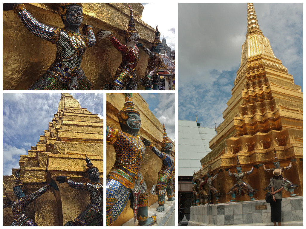 No shoes allowed for those who wish to see Emerald Buddha housed in the palace’ phra ubosot / sot or prayer room. (Upper right photo): Walls intricately and symbolically designed with those ‘Garudas’ – mythical half-man, half-bird devas which in here are defeating the ‘Naga’ – serpent
